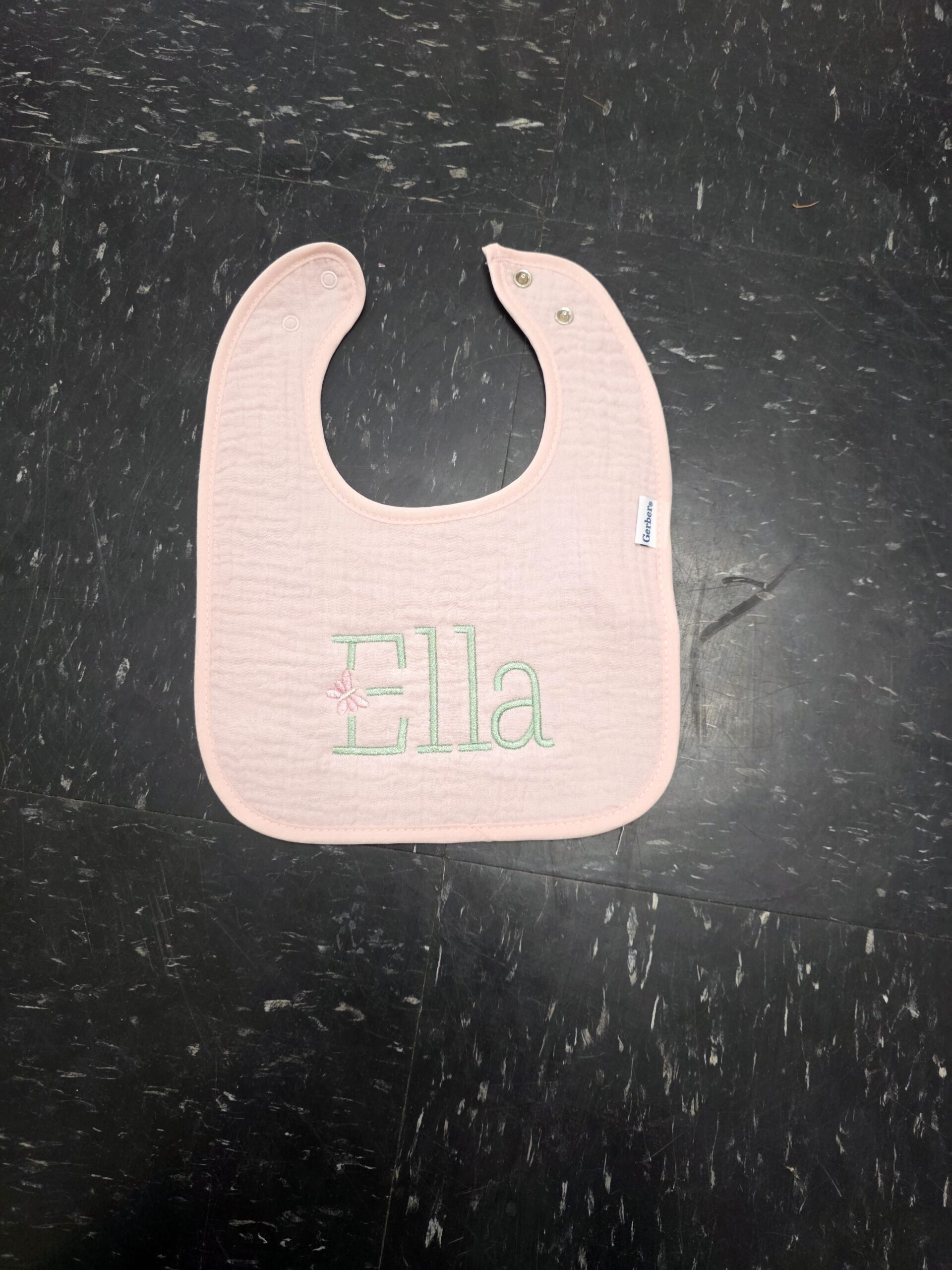 Light Pink Muslin Bib With Butterfly Font Name Monogram