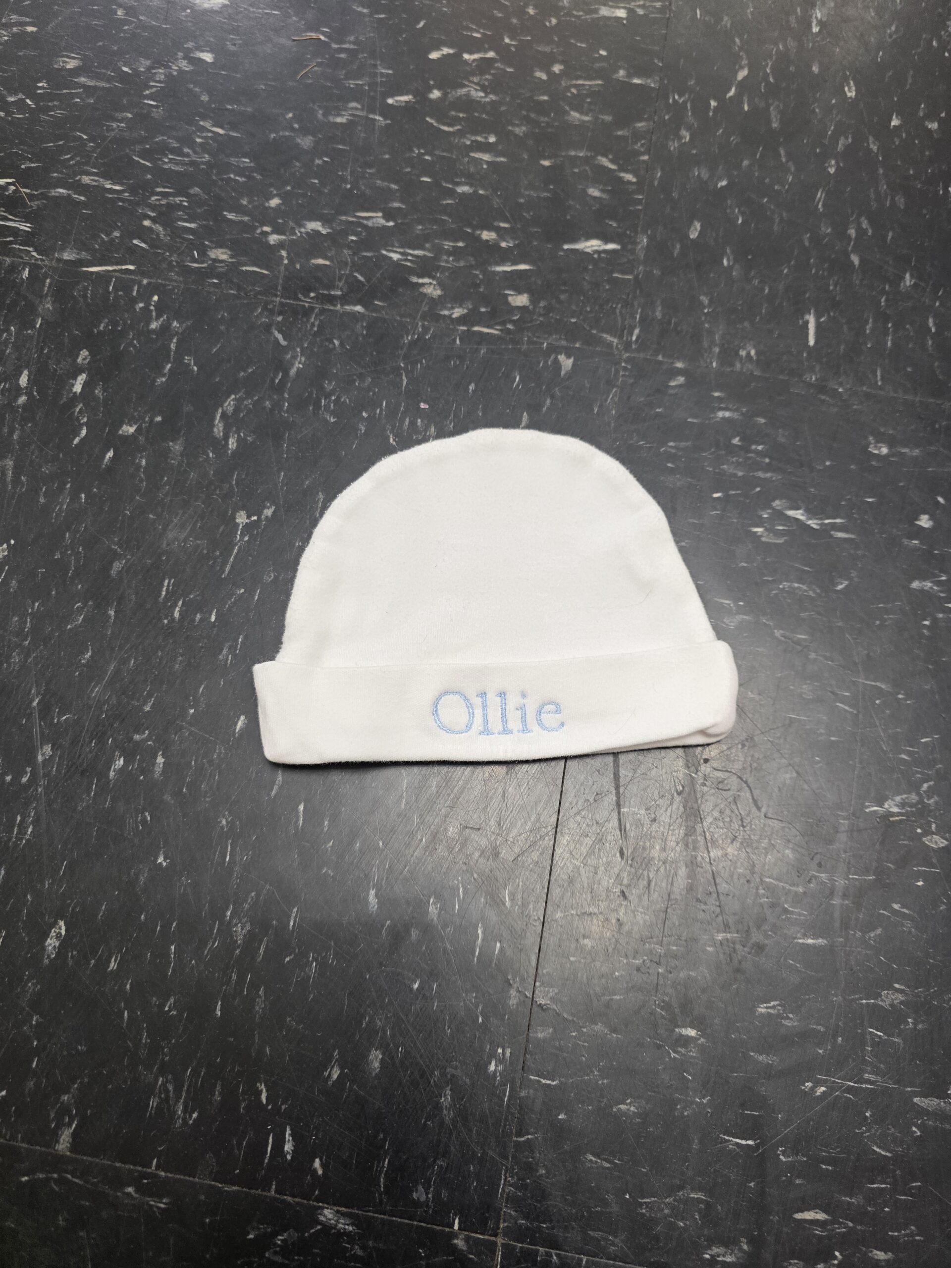 White Jersey Knit Infant Hat With Baby Blue Name Monogram